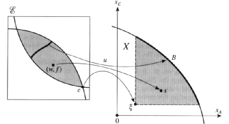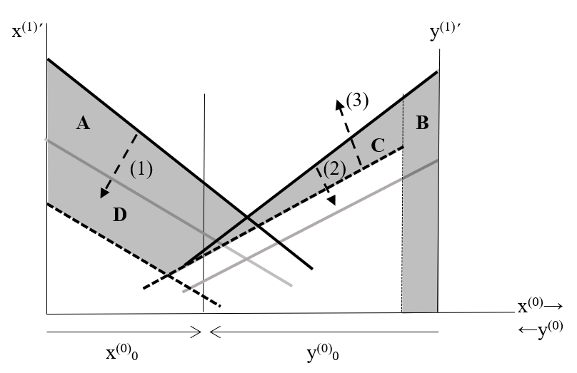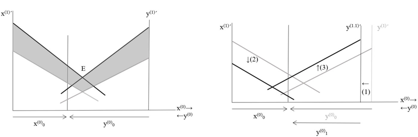 Důležité jsou bod e v levé části horního obrázku a bod ξ v pravé části. Jsou to body výchozího rozdělení statků, resp. body nedohody. Od nich se odvíjí proces směny, resp. vyjednávání.