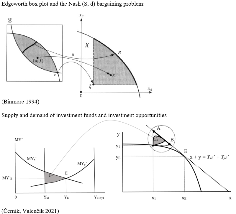 Horní část obrázku, která se sestává z Edgeworthova krabicového grafu a grafického znázornění Nashovy vyjednávacího problému v podání K. Binmore (1994), je stále významným orientujícím podnětem určitého směru bádání v oblasti teorie her, zejména teorie designu a implementace mechanismů. Zkoumání v této oblasti inicioval L. Hurwicz a našel řadu pokračovatelů. Soubor prací L. Hurwicze (včetně jeho přednášky při příležitosti udělené Nobelovy ceny za ekonomii) a jeho následovníků uspořádal Benerjee (2022). Právě teorie mechanismů ukázala význam pochopení vztahů mezi problematikou dosahování paretovského optima na trhu formou směny (horní část obrázku vlevo) a řešením Nashova vyjednávacího problému (horní část obrázku vpravo). Jedná se o podvojný graf založený na neoklasickém přístupu, tj. maximalizaci užitku (i když může mít i další interpretace, resp. lze jej různé modifikovat).
