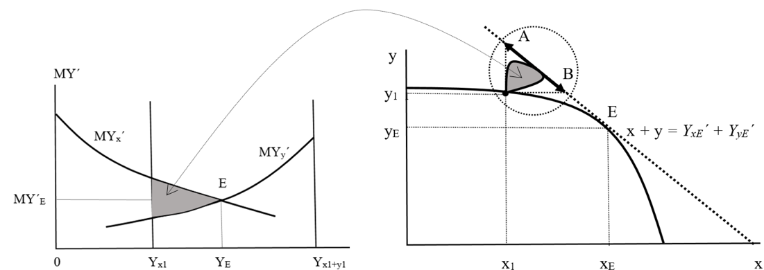 2. V levé části dolního obrázku je na horizontální ose současný příjem a na vertikální ose přírůstek příjmu jednoho (zleva doprava) a druhého (zprava doleva) ekonomického subjektu (jednotlivce, rodiny, firmy, sdružení, země...). Křivky klesající zleva doprava a zprava doleva vyjadřují klesající přírůstky příjmů, pokud investiční příležitosti využíváme (spojujeme s investičními prostředky) podle míry jejich výnosnosti (což odpovídá předpokladu individuální racionality). Teď důležité: Plochy pod křivkami odpovídají celkovému budoucímu příjmu. Graficky vyjádřený model tak ukazuje přeměnu současného příjmu v budoucí prostřednictvím využívání investičních příležitostí (jejich spojení s investičními prostředky). V pravé části dolního obrázku je totéž v celkových veličinách.