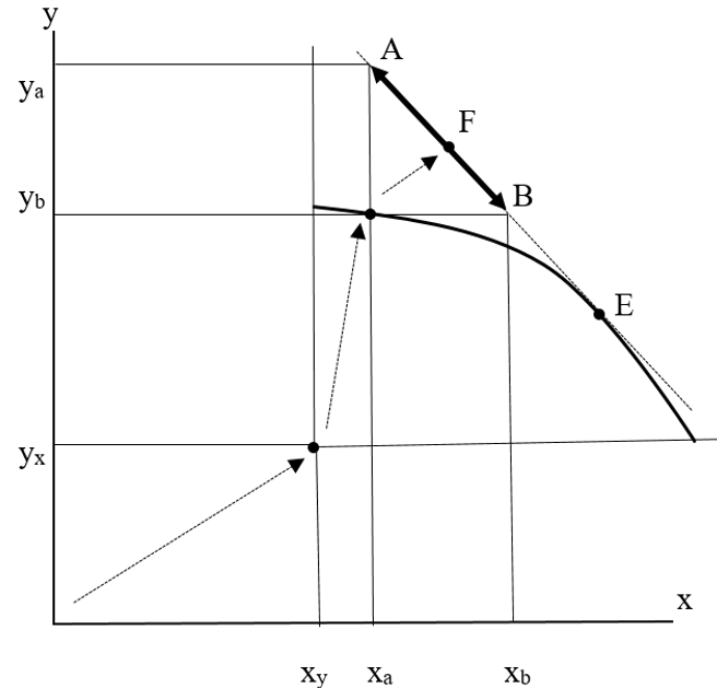 3. Pokud funguje úvěrový vztah (jeden ze subjektů může poskytnou své investiční prostředky k realizaci investičních příležitostí druhého subjektu, nabízí se možnost, aby vznikl dodatečný příjem odpovídající šedé (přibližně trojúhelníkové) ploše v levé části obrázku (a šedému "srdíčku" v pravé části obrázku). Jak se mohou subjekty o toto zlepšení podělit? To ukazuje úsečka AB ohraničená šipkami. Ve všech bodech uvnitř ní si oba hráči polepší. Je však každé rozdělení budoucího příjmu pro oba přijatelné? V případě, že si hráči zlepšují subjektivní užitek problém nevzniká. Subjektivně prožívané užitky různých jednotlivců lze porovnat jen v určitých případech a jen přibližně. To, že příliš nerovnoměrné rozdělení příjmů může jeden ze subjektů zneužít vůči druhému každý z nás ví a pociťuje. Pokud tedy existuje možnost pozičního investování (zneužití příjmové nerovnosti), musí být podmínkou řešení neutralita pozičního investování. To na bázi neoklasického schématu nejsme schopni odhalit (zviditelnit, respektovat a řešit úlohy s tím spojené). Jenže právě tím se dostáváme k odpovědi na otázku, proč stávající teorie (poplatná době a "cinknutá" podobně jako mediální mainstream, to znamená značně zideologizovaná) nechce vpustit na svoji půdu to, co by mohlo obnovit její vypovídající schopnost ve vztahu k realitě. Možná, že teď už někteří začínají chápat, k čemu je dobrá teorie a proč není tak jednoduché ji prosadit.